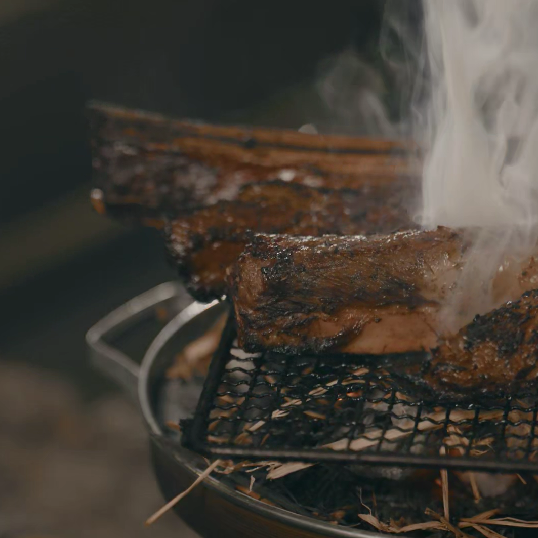 Inspired by the idea that every place has its unique scent, Mongtan drew inspiration from the traditions of Mongtan-myeon, Jeollanam-do.We reinterpreted the 'Jipbul Gui' method of grilling meat over rice straw left after harvest, smoking premium beef short ribs with organic rice straw.This process infuses the meat with a rich, nutty aroma, creating Mongtan's distinctive scent.